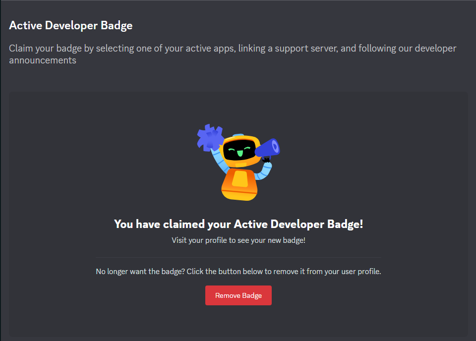 If you want the Active-Developer-Badge you can go to: Claim Badge if you ran a slash command on a discord application in the last 30 days you will be eligible to claim the badge