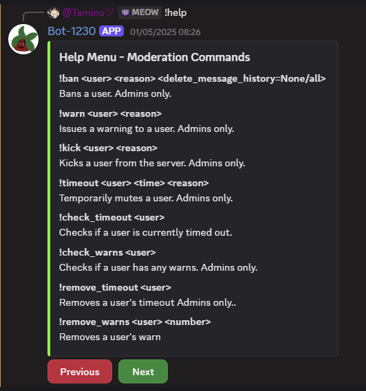 - ban <@user> <@reason*> <@delete_message_option*> Admin only